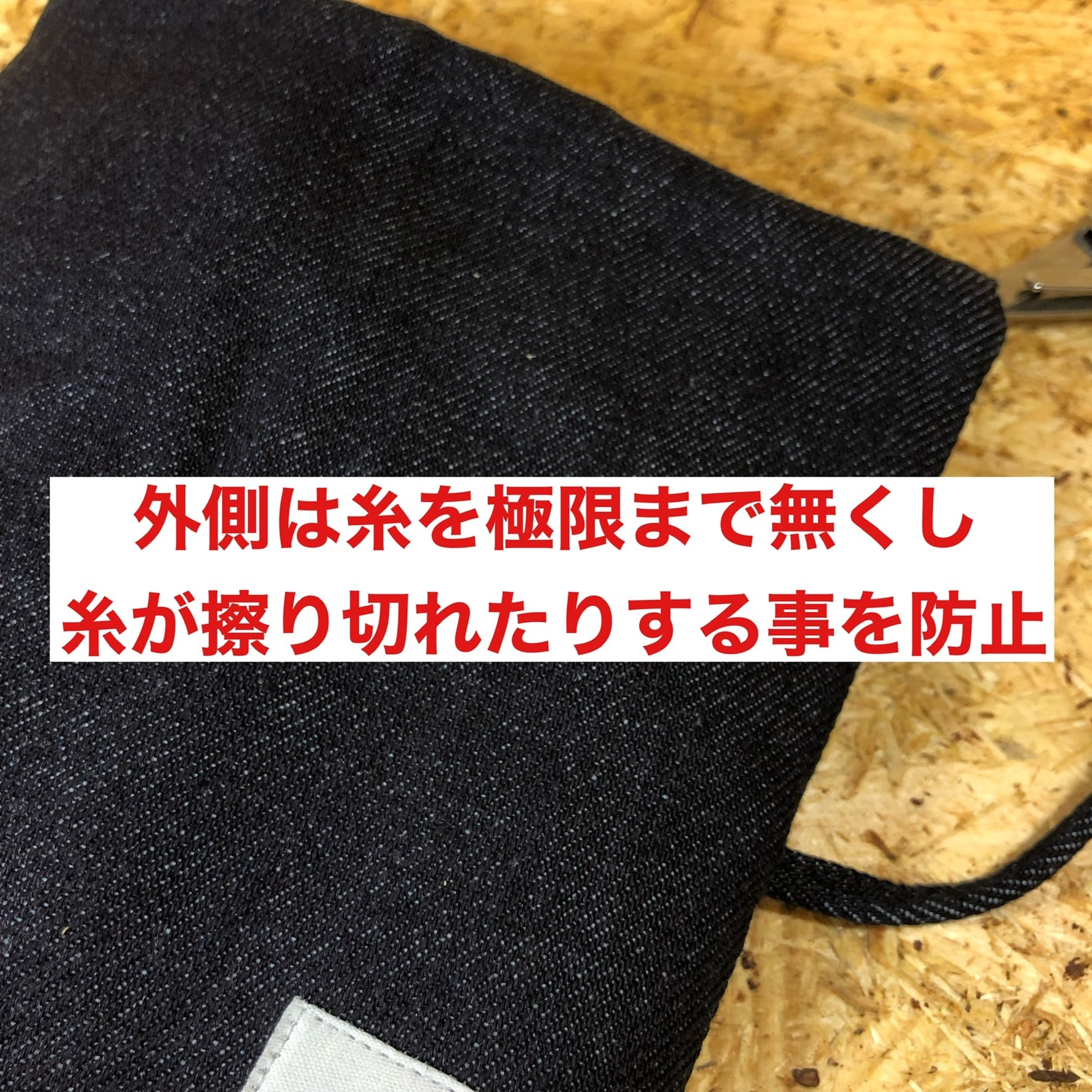 素材は、厚手のデニムを使用。縫製にもこだわりしっかりとした作りですので長くご使用いただけます。